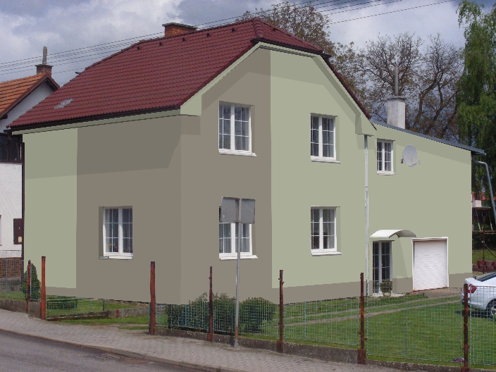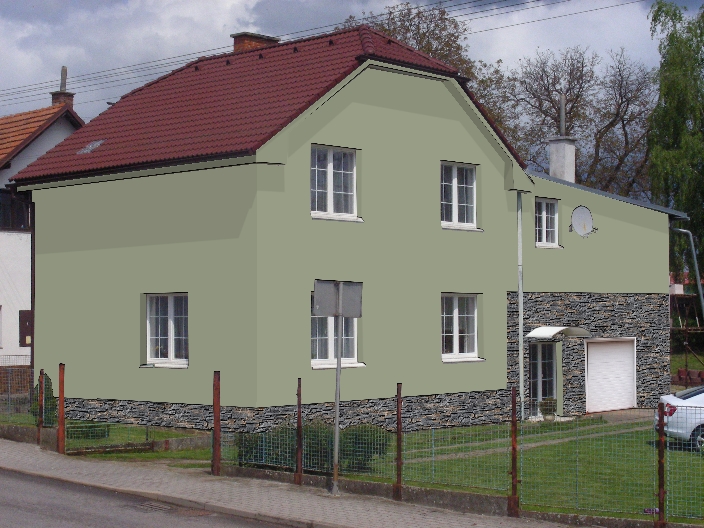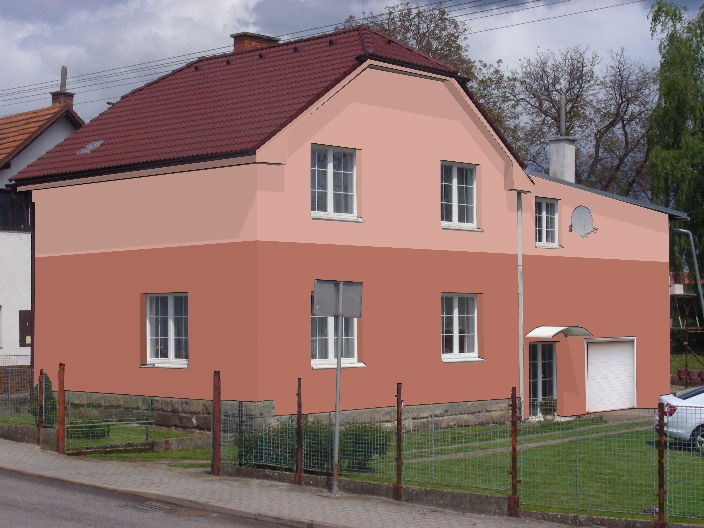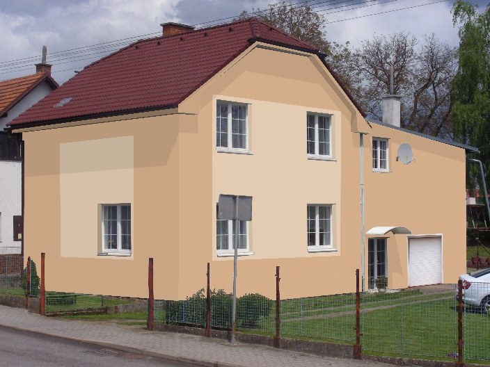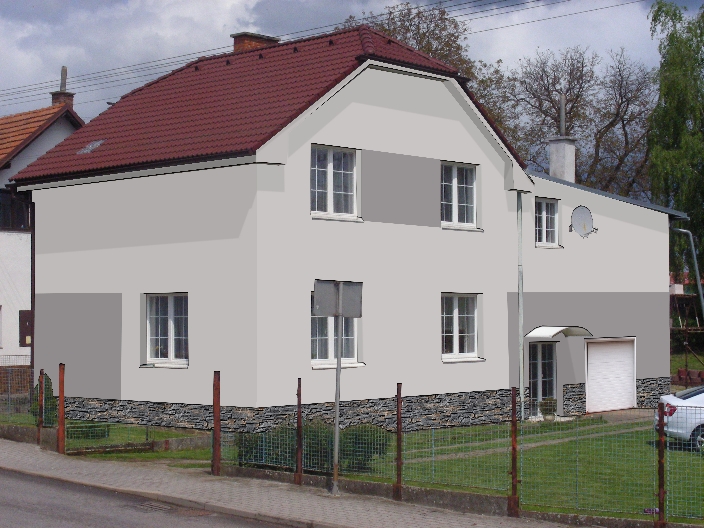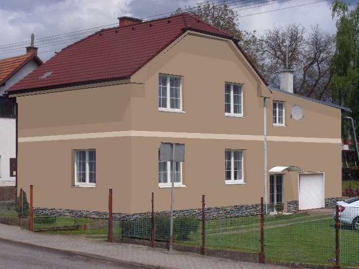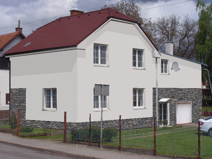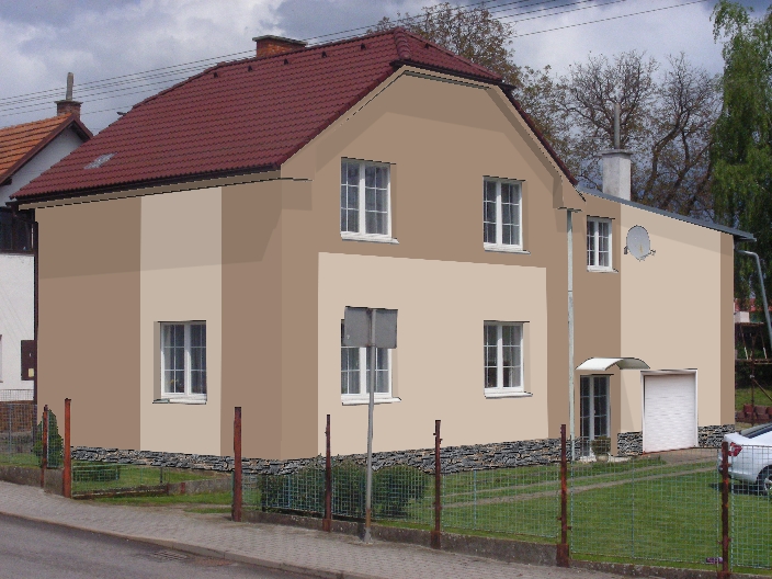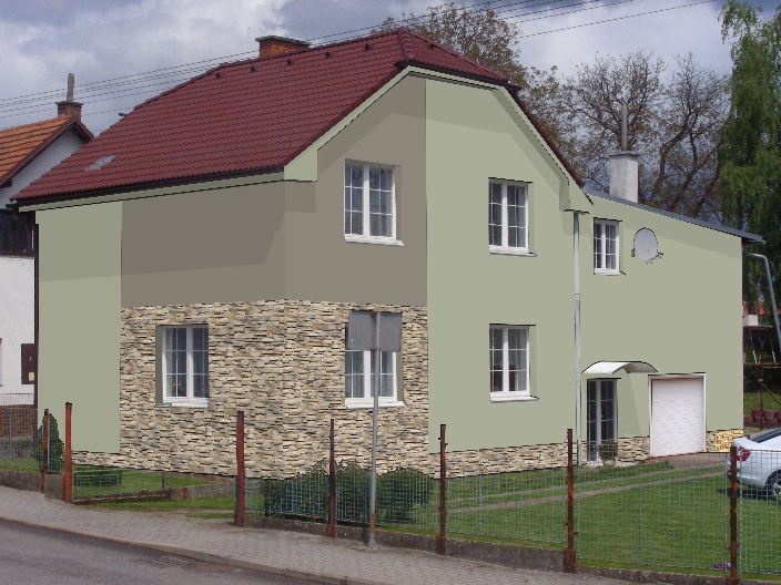 Moderní návrh rekonstrukce fasády rodinného domu pracuje s teplými přírodními odstíny a jemným členěním ploch. Hlavní fasádní plocha je řešena ve světle béžovém až pískovém tónu, který opticky zvětšuje objem domu a působí čistě a nadčasově. Doplňkové akcenty v tmavších odstínech vytvářejí zajímavé členění fasády a zvýrazňují architektonické prvky, jako jsou rohy objektu, okenní šambrány nebo vstupní část. Varianta s kamenným obkladem v soklové části přináší do návrhu přírodní prvek, zvyšuje odolnost fasády a dodává domu rustikální charakter. Kombinace hladké omítky a dekorativních ploch umožňuje vytvořit harmonický, ale vizuálně dynamický vzhled. Barevné řešení fasády je sladěno se střešní krytinou v cihlovém odstínu a podporuje celkový tradičně-moderní styl domu. Návrh nabízí více variant řešení – od minimalistického jednobarevného provedení až po výraznější členění s kontrastními plochami nebo kamenným obkladem, což umožňuje přizpůsobení podle vkusu investora i okolní zástavby.